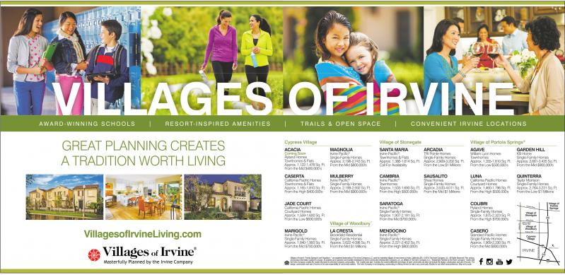 Villages of Irvine®, Portola Springs® and Woodbury™ are registered trademarks of The Irvine Company LLC, used for marketing villages of new homes in Irvine, California USA.©2013 The Irvine Company LLC. All Rights Reserved. Plan, pricing, and product information subject to change. All projects are in planned communities developed by Irvine Community Development Company LLC, an affiliate of The Irvine Company LLC. “Masterfully Planned by the Irvine Company” means that the Irvine Company created the master land plan for all Irvine Company communities. The “master land plan” includes the overall entitlement and design of each community but does not include the design, construction and sale of homes. The design, construction and sale of homes is the sole responsibility of community builders. The Irvine Company is not designing, constructing or offering homes for sale in any community.Models do not reflect racial preference. Map not to scale.