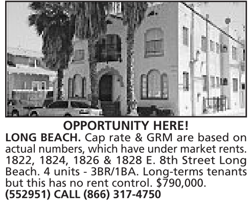 OPPORTUNITY HERE! LONG BEACH. Cap rate & GRM are based on actual numbers, which have under market rents. 1822, 1824, 1826 & 1828 E. 8th Street Long Beach. 4 units - 3BR/1BA. Long-terms tenants but this has no rent control. $790,000. (552951) CALL (866) 317-4750
