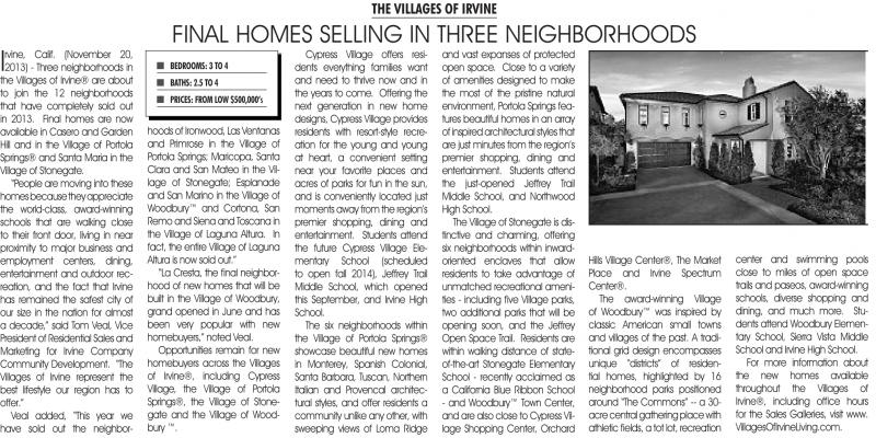 Calif. (November 20, 2013) - Three neighborhoods in the Villages of Irvine® are about to join the 12 neighborhoods that have completely sold out in 2013. Final homes are now available in Casero and Garden Hill and in the Village of Portola Springs® and Santa Maria in the Village of Stonegate.
