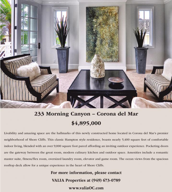 233 Morning Canyon – Corona del Mar $4,895,000 Livability and amazing space are the hallmarks of this newly constructed home located in Corona del Mar’s premier neighborhood of Shore Cliffs. This classic Hampton style residence, boasts nearly 5,400 square feet of comfortable indoor living, blended with an over 9,000 square foot parcel affording an inviting outdoor experience. Pocketing doors are the gateway between the great room, modern culinary kitchen and outdoor space. Amenities include a romantic master suite, fitness/flex room, oversized laundry room, elevator and game room. The ocean views from the spacious rooftop deck allow for a unique experience in the heart of Shore Cliffs. For more information, please contact VALIA Properties at (949) 673-0789 www.valiaOC.com