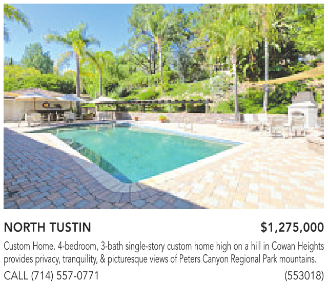 Custom Home. 4-bedroom, 3-bath single-story custom home high on ahill in Cowan Heights provides privacy, tranquility, &picturesque views of Peters Canyon Regional Park mountains.