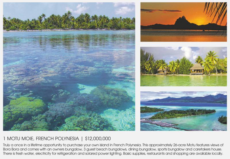 1 MOTU MOIE, FRENCH POLYNESIA | $12,000,000 Truly a once in a lifetime opportunity to purchase your own island in French Polynesia. This approximately 26-acre Motu features views of Bora Bora and comes with an owners bungalow, 3 guest beach bungalows, dining bungalow, sports bungalow and caretakers house. There is fresh water, electricity for refrigeration and solared power lighting. Basic supplies, restaurants and shopping are available locally.