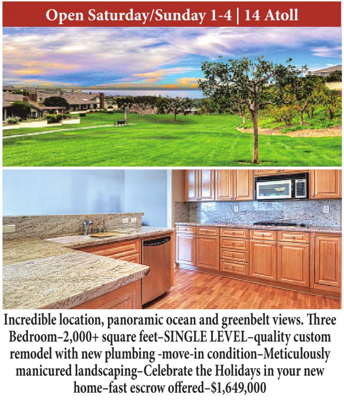 Open Saturday/Sunday 1-4 | 14 Atoll Incredible location, panoramic ocean and greenbelt views. Three Bedroom–2,000+ square feet–SINGLE LEVEL–quality custom remodel with new plumbing -move-in condition–Meticulously manicured landscaping–Celebrate the Holidays in your new home–fast escrow offered–$1,649,000