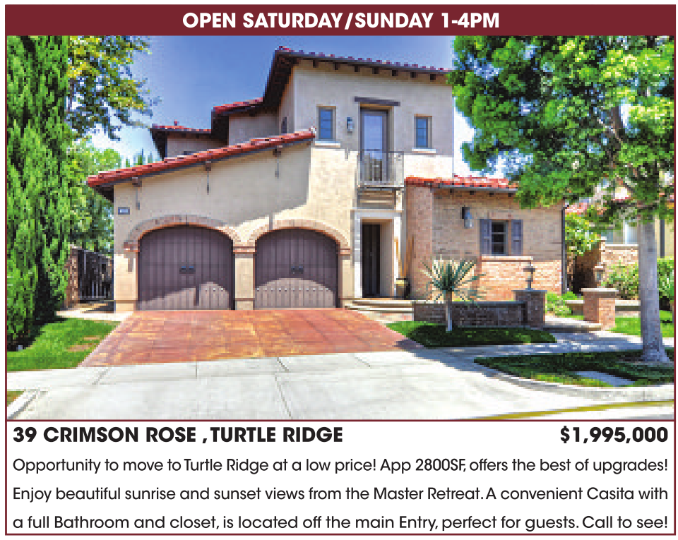 OPEN SATURDAY/SUNDAY 1-4PM 39 CRIMSON ROSE ,TURTLE RIDGE $1,995,000 Opportunity to move to Turtle Ridge at alow price! App 2800SF,offers the best of upgrades! Enjoy beautiful sunrise and sunset views from the Master Retreat.A convenient Casita with a full Bathroom and closet, is located off the main Entry, perfect for guests.Call to see! See also
