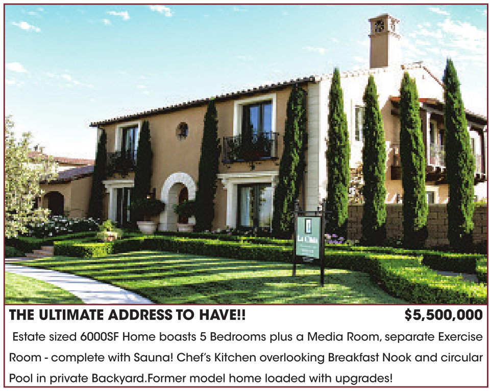 THE ULTIMATE ADDRESS TO HAVE!! $5,500,000 Estate sized 6000SF Home boasts 5 Bedrooms plus a Media Room, separate Exercise Room - complete with Sauna! Chef’s Kitchen overlooking Breakfast Nook and circular Pool in private Backyard.Former model home loaded with upgrades!