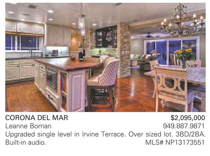 CORONA DEL MAR $2,095,000 Leanne Boman 949.887.9871 Upgraded single level in Irvine Terrace. Over sized lot. 3BD/2BA. Built-in audio. MLS# NP13173551