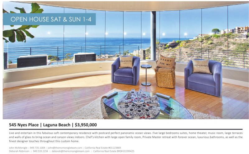 OPEN HOUSE SAT & SUN 1-4 545 Nyes Place | Laguna Beach | $3,950,000 Live and entertain in this fabulous soft contemporary residence with postcard perfect panoramic ocean views. Five large bedrooms suites, home theater, music room, large terraces and walls of glass to bring ocean and canyon views indoors. Chef’s kitchen with large open family room, Private Master retreat with forever ocean, luxurious bathrooms, as well as the finest designer touches throughout this custom home. John McMonigle :: 949.735.1004 :: john@themcmonigleteam.com :: California Real Estate #01123869 Deborah Robinson :: 949.533.2234 :: deborah@themcmonigleteam.com :: California Real Estate BRE# 01399425