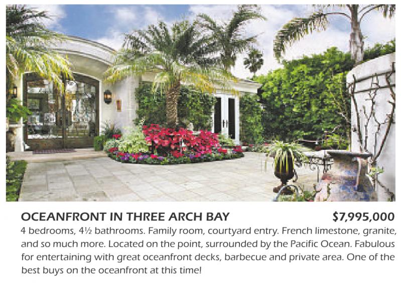 OCEANFRONT IN THREE ARCH BAY $7,995,000 4 bedrooms, 4½ bathrooms. Family room, courtyard entry. French limestone, granite, and so much more. Located on the point, surrounded by the Pacific Ocean. Fabulous for entertaining with great oceanfront decks, barbecue and private area. One of the best buys on the oceanfront at this time!