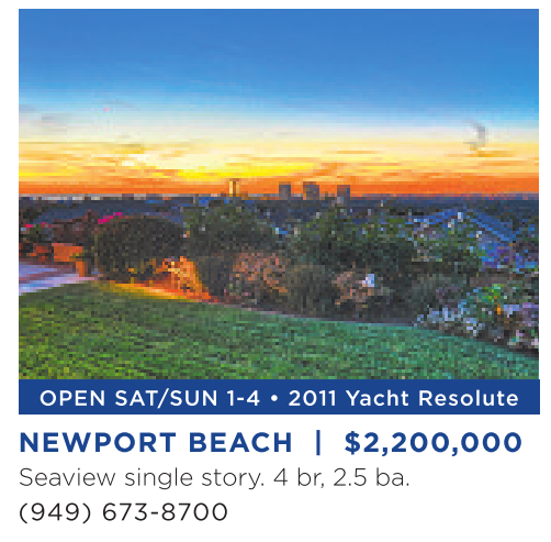 OPEN SAT/SUN 1-4 • 2011 Yacht Resolute NEWPORT BEACH | $2,200,000 Seaview single story. 4 br, 2.5 ba. (949) 673-8700