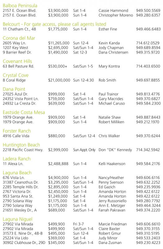 Balboa Peninsula 2157 E. Ocean Blvd. $3,900,000 Sat 1-4 Cassie Hammond 949.500.5569 2157 E. Ocean Blvd. $3,900,000 Sun 1-4 Christopher Moreno 949.280.6357 Belcourt - For gate access, please call agents listed 11 Chatham Ct., 48 $1,775,000 Sun 1-4 Esther Fine 949.466.6483 Corona del Mar 2605 Way Ln. $11,265,000 Sun 12-4 Kevin Kanda 714.612.0529 1207 Key West $2,695,000 Sat/Sun 1-4 Jody Chapman 949.689.8594 9 Barrier Reef Dr. $1,490,000 Sat 12-3 Dana Christensen 949.315.9720 Covenant Hills 63 Bell Pasture Rd. $530,000+ Sat/Sun 1-5 Mary Kontra 714.403.6500 Crystal Cove 8 Coral Ridge $21,000,000 Sun 12-4:30 Rob Smith 949.697.8855 Dana Point 27025 Azul Dr. $999,000 Sat 1-4 Paul Trainor 949.813.4776 24352 Vista Point Ln. $759,000 Sat/Sun 1-4 Gary Macrides 949.370.6827 24932 La Cresta Dr. $639,000 Sat/Sun 1-4 Michael Caruso 949.584.2300 Eastside Costa Mesa 1979 Orange Ave. $909,000 Sat 1-4 Natalie Shaw 949.887.8443 1979 Orange Ave. $909,000 Sun 1-4 Robert Milliken 949.212.1970 Forster Ranch 4916 Calle Vida $880,000 Sat/Sun 12-4 Chris Walker 949.370.6244 Huntington Beach 2218 Pacific Coast Hwy. $2,999,000 SunAppt. Only Don "DK" Kennedy 714.342.5942 Ladera Ranch 11 Alexa Ln. $2,488,888 Sun 1-4 Kelli Haakenson 949.584.2176 Laguna Beach 676 Vista Ln. $4,900,000 Sun 1-4 Nancy/Heather 949.606.6116 31387 Ceanothus Dr. $3,295,000 Sat/Sun 1-4 Penny Svenson 949.632.2252 2285 Temple Hills Dr. $2,895,000 Sun 1-4 Ed Gazich 949.235.9936 2767 Victoria Dr. $2,450,000 Sun 1-4 Amanda Horton 949.422.6122 953 Santa Ana St. $1,249,000 Sat 1-4 Amanda Horton 949.422.6122 2790 Solana Way $1,175,000 Sat 1-4 Jerry Russoniello 949.280.7792 2790 Solana Way $1,175,000 Sun 1-4 Ann E. Metzger 949.464.3244 21651 Wesley Dr., A $689,000 Sat/Sun 1-4 Farrah Pakravan 949.374.2220 Laguna Niguel 27902 Via Mirada $499,900 Fri 3-7 Marcie Friedman 949.606.6610 27902 Via Mirada $499,900 Sat/Sun 1-4 Claire Baxter 949.370.3155 31573 E. Nine Dr., 48-B $495,000 Sun 12-4 Robert Gmur 949.310.5195 25224 Via Lido $369,000 Sat 1-4 Judy Minor 949.533.2403 30902Clubhouse Dr., 29D $345,000 Sat/Sun 1-4 Dana Zusman 949.230.4223