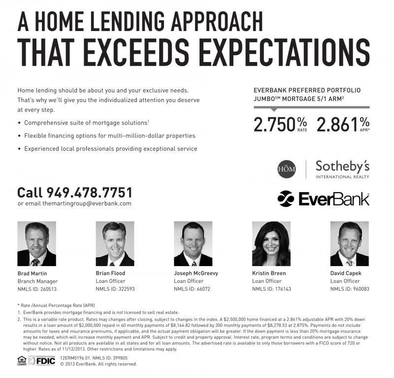 A HOME LENDING APPROACH THAT EXCEEDS EXPECTATIONS Home lending should be about you and your exclusive needs. That’s why we’ll give you the individualized attention you deserve at every step. EVERBANK PREFERRED PORTFOLIO JUMBO SM MORTGAGE 5/1 ARM 2 • Comprehensive suite of mortgage solutions 1 • Flexible financing options for multi-million-dollar properties • Experienced local professionals providing exceptional service 2.750 % RATE 2.861 % APR* Call 949.478.7751 or email themartingroup@everbank.com Brad Martin Branch Manager NMLS ID: 260513 Brian Flood Loan Officer NMLS ID: 322593 Joseph McGreevy Loan Officer NMLS ID: 66072 Kristin Breen Loan Officer NMLS ID: 176143 David Capek Loan Officer NMLS ID: 960083 * Rate /Annual Percentage Rate (APR) 1. EverBank provides mortgage financing and is not licensed to sell real estate. 2. This is a variable rate product. Rates may changes after closing, subject to changes in the index. A $2,500,000 home financed at a 2.861% adjustable APR with 20% down results in a loan amount of $2,000,000 repaid in 60 monthly payments of $8,164.82 followed by 300 monthly payments of $8,278.53 at 2.875%. Payments do not include amounts for taxes and insurance premiums, if applicable, and the actual payment obligation will be greater. If the down payment is less than 20% mortgage insurance may be needed, which will increase monthly payment and APR. Subject to credit and property approval. Interest rate, program terms and conditions are subject to change without notice. Not all products are available in all states and for all loan amounts. The advertised rate is available to only those borrowers with a FICO score of 720 or higher. Rates as of 11/12/2013. Other restrictions and limitations may apply. 12ERM0196.01. NMLS ID: 399805 © 2013 EverBank. All rights reserved.