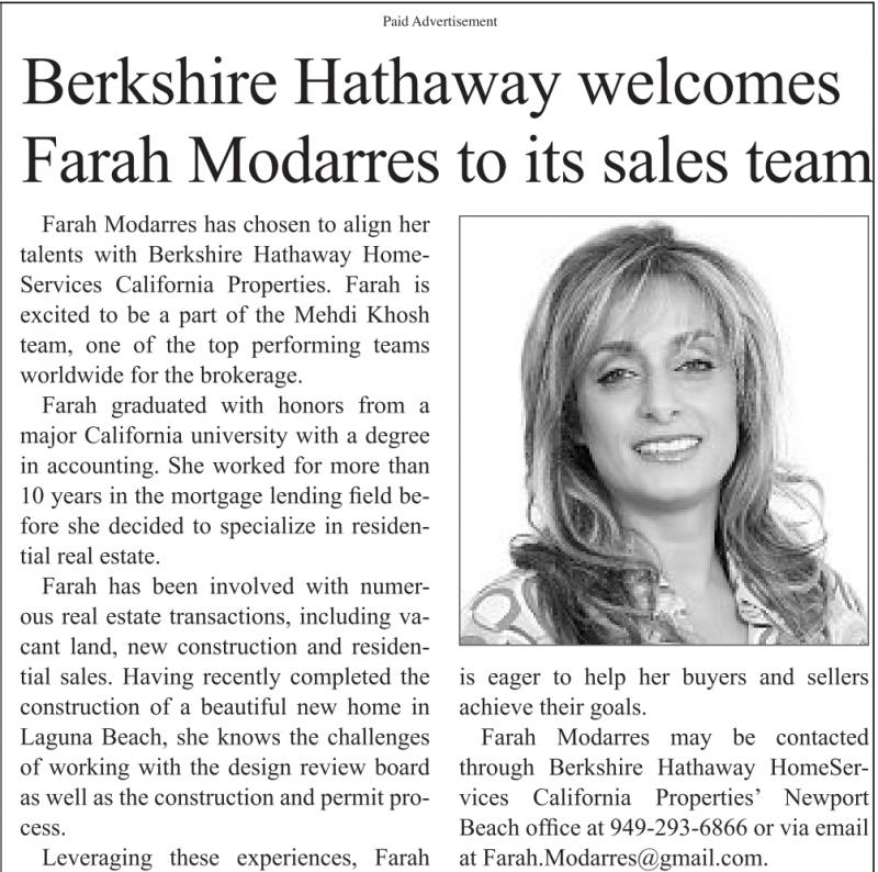Farah Modarres may be contacted through Berkshire Hathaway HomeServices California Properties’ Newport Beach office at 949-293-6866 or via email at Farah.Modarres@gmail.com.