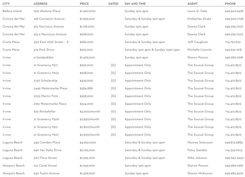 CITY ADDRESS PRICE GATED DAY AND TIME AGENT PHONE Balboa Island 1516 Abalone Place $1,490,000 Sunday 1pm-4pm Laura G. Gale 949.500.6418 Corona del Mar 418 Carnation Avenue $1,995,000 Saturday & Sunday 1pm-4pm Kimberlee Drake 949.500.7108 Corona del Mar 415 Narcissus Avenue $1,128,000 Sunday 1pm-4pm Dawna Clark 949.293.7202 Corona del Mar 415.5 Narcissus Avenue $998,000 Sunday 1pm-4pm Dawna Clark 949.293.7202 Costa Mesa 350 East 20th Street – A $682,000 Saturday & Sunday 1pm-4pm Jeff Caughren 714.797.6151 Costa Mesa 574 Park Drive $675,000 Saturday 1pm-4pm & Sunday 12pm-3pm Michelle Linovitz 949.632.1618 Irvine 4 Sandpebble $1,499,000 Sunday 1pm-4pm Sharon Paxson 949.280.0681 Irvine 21 Gramercy #317 $699,000 [G] Appointment Only The Soussé Group 714.412.8512 Irvine 21 Gramercy #203 $628,000 [G] Appointment Only The Soussé Group 714.412.8512 Irvine 2130 Scholarship $439,000 [G] Appointment Only The Soussé Group 714.412.8512 Irvine 2449 Watermarke Place $384,888 [G] Appointment Only The Soussé Group 714.412.8512 Irvine 2233 Martin #106 $358,000 [G] Appointment Only The Soussé Group 714.412.8512 Irvine 2163 Watermarke Place $324,000 [G] Appointment Only The Soussé Group 714.412.8512 Irvine 625 Rockefeller $3,000/month [G] Appointment Only The Soussé Group 714.412.8512 Irvine 21 Gramercy #306 $2,950/month [G] Appointment Only The Soussé Group 714.412.8512 Irvine 21 Gramercy #412 $2,800/month [G] Appointment Only The Soussé Group 714.412.8512 Irvine 21 Gramercy #207 $2,600/month [G] Appointment Only The Soussé Group 714.412.8512 Laguna Beach 345 Camden Place $4,950,000 Saturday & Sunday 1pm-4pm Nancee Swensson 949.813.6883 Laguna Beach 949 Van Dyke Drive $2,195,000 Saturday & Sunday 1pm-4pm Patsy Gamble 714.325.6103 Laguna Beach 370 Flora Street $1,995,000 Saturday & Sunday 1pm-4pm Mike Johnson 949.342.3650 Newport Beach 231 Canal Street $1,649,000 Saturday 1pm-4pm Sharon Paxson 949.280.0681 Newport Beach 542 Tustin Avenue $1,399,000 Sunday 1pm-4pm Sharon McKinnon 949.683.4016