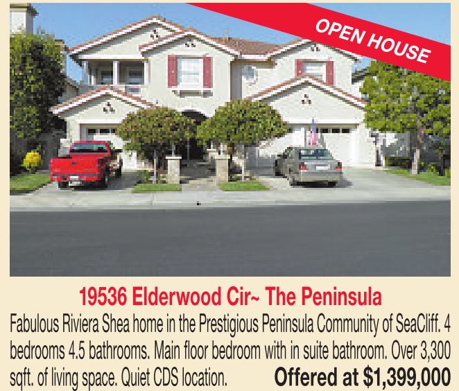 19536 Elderwood Cir~ The Peninsula Fabulous Riviera Shea home in the Prestigious Peninsula Community ofSeaCliff. 4bedrooms 4.5 bathrooms. Main floor bedroom with insuite bathroom. Over 3,300 sqft. ofliving space. Quiet CDS location. Offered at $1,399,000