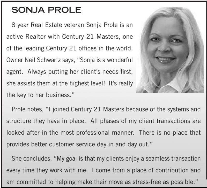 34 SONJA PROLE 8 year Real Estate veteran Sonja Prole is an active Realtor with Century 21 Masters, one of the leading Century 21 offices in the world. Owner Neil Schwartz says, “Sonja is a wonderful agent. Always putting her client’s needs first, she assists them at the highest level! It’s really the key to her business.” Prole notes, “I joined Century 21 Masters because of the systems and structure they have in place. All phases of my client transactions are looked after in the most professional manner. There is no place that provides better customer service day in and day out.” She concludes, “My goal is that my clients enjoy a seamless transaction every time they work with me. I come from a place of contribution and am committed to helping make their move as stress-free as possible.”