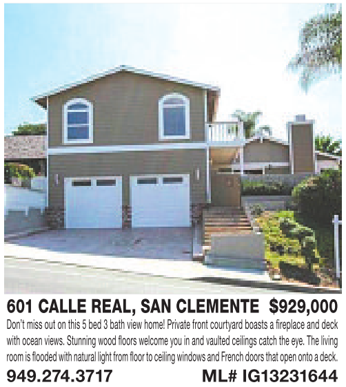 601 CALLE REAL, SAN CLEMENTE $929,000 Don’t miss out on this 5bed 3bath view home! Private front courtyard boasts afireplace and deck with ocean views. Stunning wood floors welcome you inand vaulted ceilings catch the eye. The living room is floodedwithnaturallight from floor to ceilingwindows andFrench doorsthat open onto adeck. 949.274.3717 ML# IG13231644
