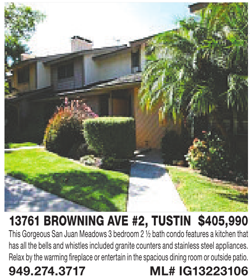 13761 BROWNING AVE #2, TUSTIN $405,990 This GorgeousSan Juan Meadows3bedroom 2½bathcondo features akitchen that hasall thebells andwhistlesincluded granite counters andstainless steelappliances. Relaxbythe warmingfireplace or entertaininthe spaciousdining room or outside patio. 949.274.3717 ML# IG13223106