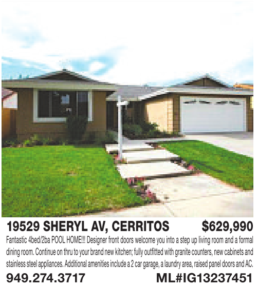 19529 SHERYL AV, CERRITOS $629,990 Fantastic 4bed/2ba POOL HOME!!! Designer front doors welcome you into astep upliving room and aformal dining room. Continueonthrutoyour brandnew kitchen; fullyoutfittedwithgranitecounters, newcabinets and stainless steelappliances. Additional amenitiesinclude a2car garage,alaundryarea, raisedpanel doorsand AC. 949.274.3717 ML#IG13237451