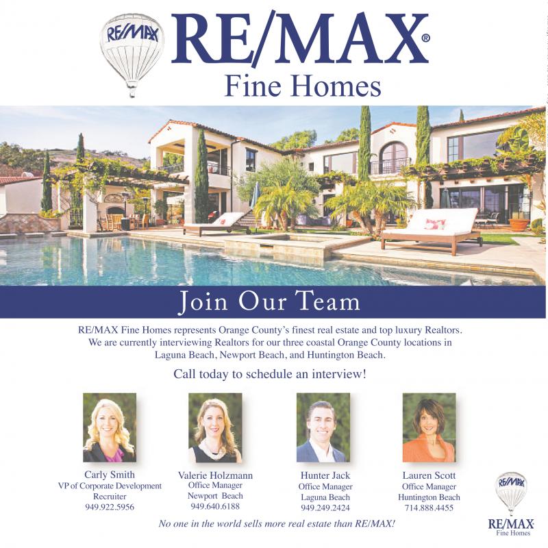 47 Fine Homes J o i n O u r Te a m RE/MAX Fine Homes represents Orange County’s finest real estate and top luxury Realtors. We are currently interviewing Realtors for our three coastal Orange County locations in Laguna Beach, Newport Beach, and Huntington Beach. Call today to schedule an interview! Carly Smith VP of Corporate Development Recruiter 949.922.5956 Valerie Holzmann Office Manager Newport Beach 949.640.6188 Hunter Jack Office Manager Laguna Beach 949.249.2424 No one in the world sells more real estate than RE/MAX! Lauren Scott Office Manager Huntington Beach 714.888.4455 Fine Homes