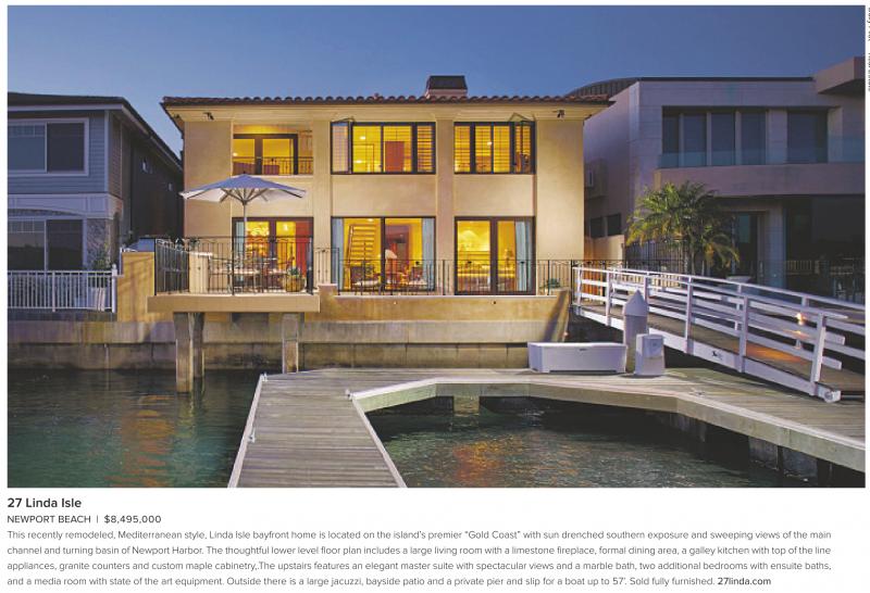 27 Linda Isle NEWPORT BEACH | $8,495,000 This recently remodeled, Mediterranean style, Linda Isle bayfront home is located on the island’s premier “Gold Coast” with sun drenched southern exposure and sweeping views of the main channel and turning basin of Newport Harbor.The thoughtful lower level floor plan includes alarge living room with alimestone fireplace,formal dining area, agalley kitchen with top of the line appliances, granite counters and custom maple cabinetry,.The upstairs features an elegant master suite with spectacular views and a marble bath, two additional bedrooms with ensuite baths, and a media room with state of the art equipment. Outside there is a large jacuzzi, bayside patio and a private pier and slip for a boat up to 57’. Sold fully furnished. 27linda.com