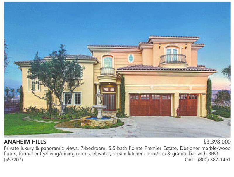 ANAHEIM HILLS $3,398,000 Private luxury & panoramic views. 7-bedroom, 5.5-bath Pointe Premier Estate. Designer marble/wood floors, formal entry/living/dining rooms, elevator, dream kitchen, pool/spa & granite bar with BBQ. (553207) CALL (800) 387-1451