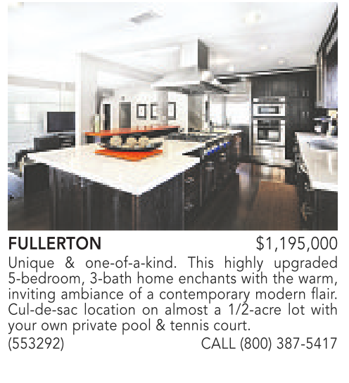 FULLERTON $1,195,000 Unique & one-of-a-kind. This highly upgraded 5-bedroom, 3-bath home enchants with the warm, inviting ambiance of a contemporary modern flair. Cul-de-sac location on almost a 1/2-acre lot with your own private pool & tennis court. (553292) CALL (800) 387-5417