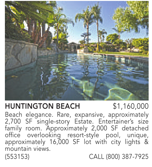HUNTINGTON BEACH $1,160,000 Beach elegance. Rare, expansive, approximately 2,700 SF single-story Estate. Entertainer’s size family room. Approximately 2,000 SF detached office overlooking resort-style pool, unique, approximately 16,000 SF lot with city lights & mountain views. (553153) CALL (800) 387-7925