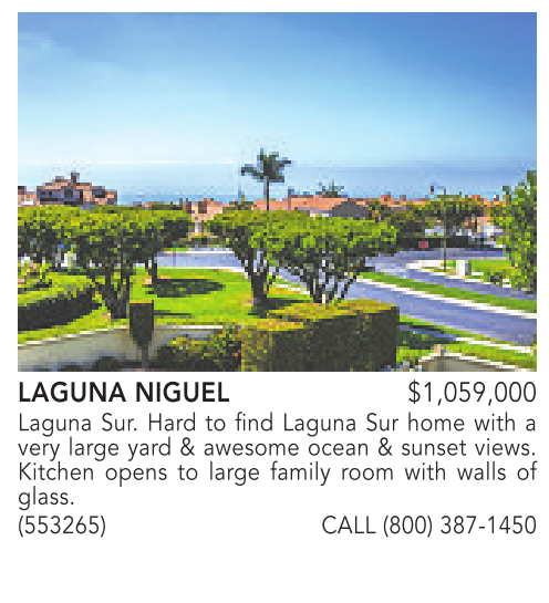 LAGUNA NIGUEL $1,059,000 Laguna Sur. Hard to find Laguna Sur home with a very large yard & awesome ocean & sunset views. Kitchen opens to large family room with walls of glass. (553265) CALL (800) 387-1450
