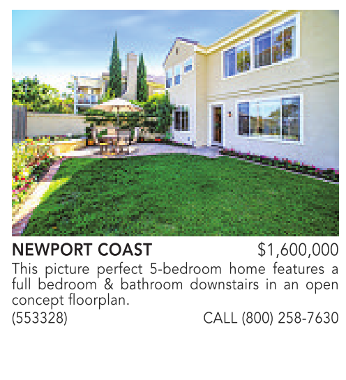 NEWPORT COAST $1,600,000 This picture perfect 5-bedroom home features a full bedroom & bathroom downstairs in an open concept floorplan. (553328) CALL (800) 258-7630