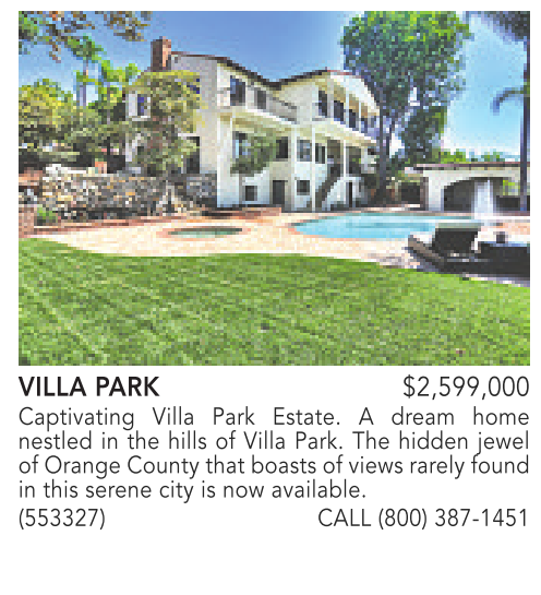 VILLA PARK $2,599,000 Captivating Villa Park Estate. A dream home nestled in the hills of Villa Park. The hidden jewel of Orange County that boasts of views rarely found in this serene city is now available. (553327) CALL (800) 387-1451