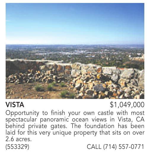 VISTA $1,049,000 Opportunity to finish your own castle with most spectacular panoramic ocean views in Vista, CA behind private gates. The foundation has been laid for this very unique property that sits on over 2.6 acres. (553329) CALL (714) 557-0771