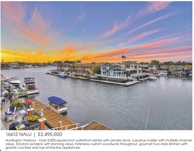 16612 NALU | $2,495,000 Huntington Harbour - Over 5,000 square-foot waterfront estate with private dock. Luxurious master with multiple channel views. 3rd-story sundeck with stunning views. Extensive custom woodwork throughout, gourmet Euro-style kitchen with granite counters and top-of-the-line appliances.