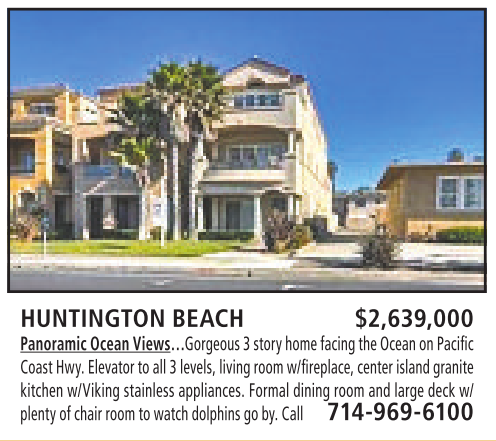 HUNTINGTON BEACH $2,639,000 Panoramic Ocean Views…Gorgeous 3story home facing theOcean on Pacific CoastHwy.Elevator to all3levels, living room w/fireplace,center island granite kitchen w/Viking stainless appliances. Formal dining room and large deck w/ plentyofchairroomtowatchdolphinsgoby. Call 714-969-6100