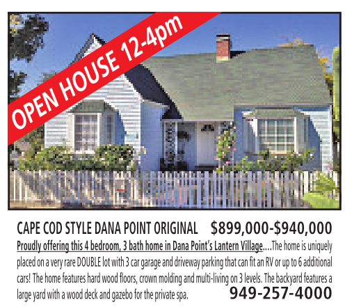 CAPE COD STYLE DANA POINT ORIGINAL $899,000-$940,000 Proudly offering this 4bedroom, 3bath home in Dana Point’s Lantern Village.…Thehome is uniquely placed on averyrareDOUBLElot with 3car garageand driveway parkingthat canfitanRVorupto6additional cars!The home featureshardwood floors, crown molding and multi-living on 3levels.The backyard featuresa large yard with awood deck andgazebo for theprivatespa. 949-257-4000