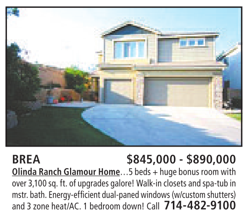 BREA $845,000 - $890,000 Olinda RanchGlamour Home…5 beds +hugebonus room with over3,100 sq. ft.ofupgrades galore!Walk-inclosets andspa-tub in mstr. bath.Energy-efficient dual-panedwindows (w/custom shutters) and3zone heat/AC. 1bedroomdown! Call 714-482-9100