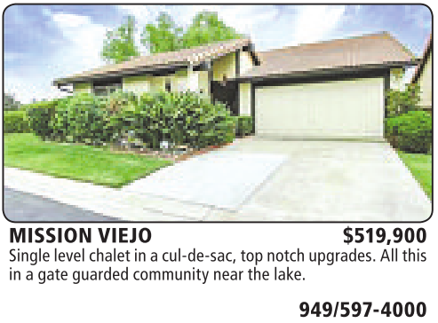 MISSION VIEJO $519,900 Single level chalet in acul-de-sac, topnotch upgrades. Allthis in agateguarded communitynear thelake.