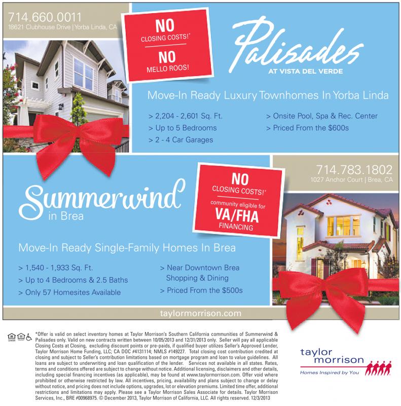 714.660.0011 18621 Clubhouse Drive |Yorba Linda, CA Move-In Ready Luxury Townhomes In Yorba Linda > 2,204 - 2,601 Sq. Ft. > Up to 5 Bedrooms > 2 - 4 Car Garages > Onsite Pool, Spa & Rec. Center > Priced From the $600s 714.783.1802 1027 Anchor Court | Brea, CA in Brea Move-In Ready Single-Family Homes In Brea > 1,540 - 1,933 Sq. Ft. > Up to 4 Bedrooms & 2.5 Baths > Only 57 Homesites Available > Near Downtown Brea Shopping & Dining > Priced From the $500s taylormorrison.com *Offer is valid on select inventory homes at Taylor Morrison’s Southern California communities of Summerwind & Palisades only. Valid on new contracts written between 10/05/2013 and 12/31/2013 only. Seller will pay all applicableable Closing Costs at Closing, excluding discount points or pre-paids, if qualified buyer utilizes Seller’s Approved Lender, Taylor Morrison Home Funding, LLC; CA DOC #4131114; NMLS #149227. Total closing cost contribution credited at closing and subject to Seller’s contribution limitations based on mortgage program and loan to value guidelines. All loans are subject to underwriting and loan qualification of the lender. Services not available in all states. Rates, terms and conditions offered are subject to change without notice. Additional licensing, disclaimers and other details, including special financing incentives (as applicable), may be found at www.taylormorrison.com. Offer void where prohibited or otherwise restricted by law. All incentives, pricing, availability and plans subject to change or delay without notice, and pricing does not include options, upgrades, lot or elevation premiums. Limited time offer,additional restrictions and limitations may apply. Please see a Taylor Morrison Sales Associate for details. Taylor Morrison Services, Inc., BRE #00968975. ©December 2013, Taylor Morrison of California, LLC. All rights reserved. 12/3/2013