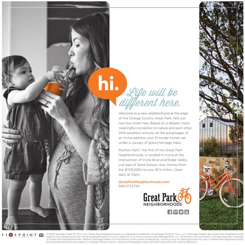 © 2013 Heritage Fields El Toro, LLC. Great Park Neighborhoods is a registered trademark of Heritage Fields El Toro, LLC (Heritage Fields) dba Great Park Neighborhoods used for the marketing ofnew home neighborhoods in Irvine, California. Five Point Communities Management, Inc. (Five Point Communities) is the development manager of Great Park Neighborhoods. Neither Heritage Fields nor Five Point Communities is designing, constructing or offering homes for sale in Great Park Neighborhoods. All proposed amenities are subject tochange without notice. Lifestyle photography does not reflect any ethnic orracial preference.