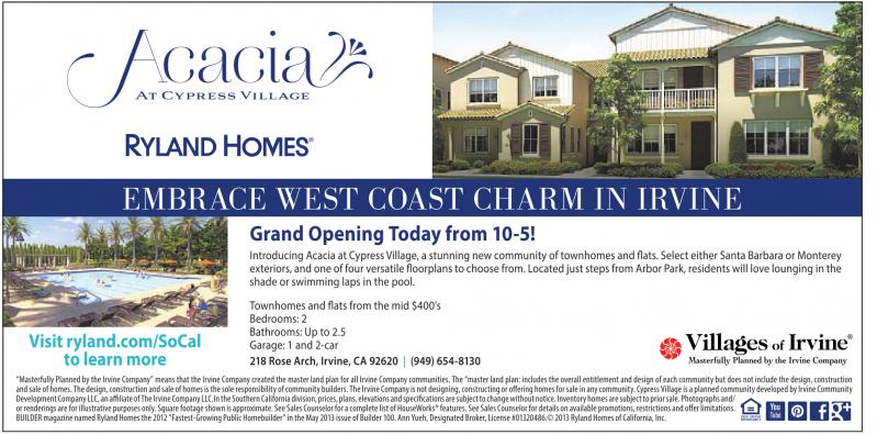 “Masterfully Plannedbythe Irvine Company” means that the Irvine Companycreatedthe masterland plan forall Irvine Companycommunities.The “masterlandplan: includesthe overallentitlement and design of eachcommunity butdoes not include thedesign,construction and sale of homes. The design,construction and sale of homes is the sole responsibilityofcommunitybuilders. The Irvine Companyisnot designing, constructing or offering homes forsale in anycommunity.Cypress Village is aplanned communitydevelopedbyIrvine Community DevelopmentCompanyLLC,anaffiliateofTheIrvineCompanyLLC.IntheSouthernCaliforniadivision,prices,plans,elevationsandspecificationsaresubjecttochangewithoutnotice. Inventoryhomesaresubjecttopriorsale.Photographsand/ or renderings are forillustrativepurposes only.Square footage shown is approximate. SeeSales Counselor foracomplete listofHouseWorks®features. See SalesCounselor fordetails on available promotions,restrictions and offer limitations. BUILDER magazine namedRyland Homes the 2012 “Fastest-Growing Public Homebuilder”inthe May2013issue of Builder 100. Ann Yueh,DesignatedBroker,License#01320486.© 2013 Ryland HomesofCalifornia,Inc.
