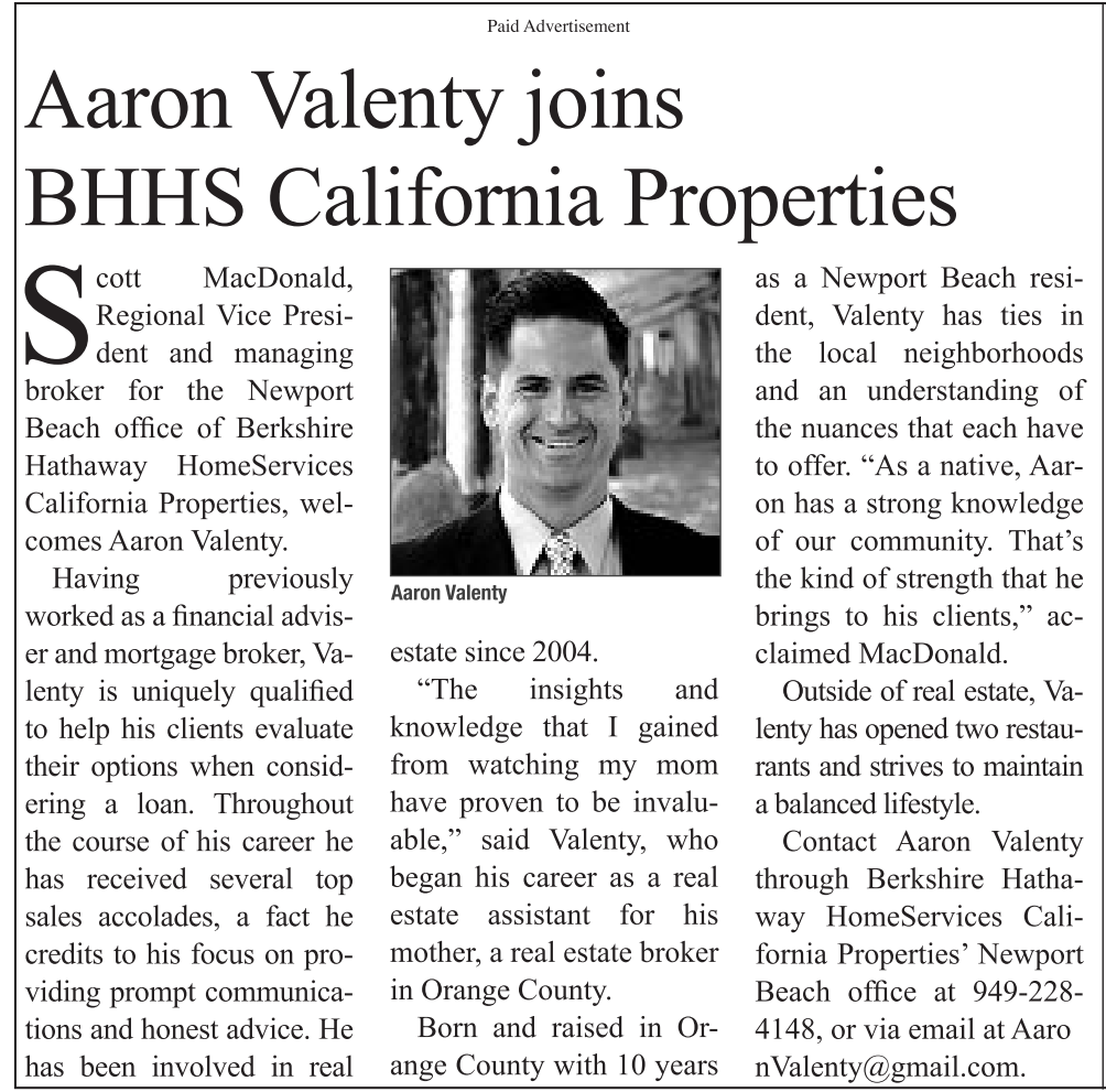 Contact Aaron Valenty through Berkshire Hathaway HomeServices California Properties’ Newport Beach office at 949-228- 4148, or via email at Aaro nValenty@gmail.com.