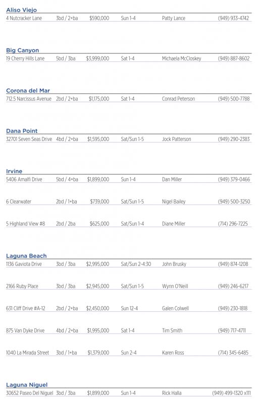 Laguna Niguel 30652 Paseo Del Niguel 3bd /3ba $1,899,000 Sun 1-4 Rick Halla (949) 499-1320 x111