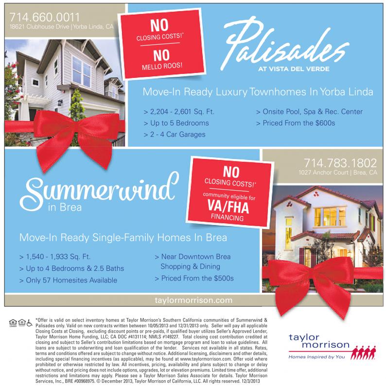 714.660.0011 18621 Clubhouse Drive |Yorba Linda, CA Move-In Ready Luxury Townhomes In Yorba Linda > 2,204 - 2,601 Sq. Ft. > Up to 5 Bedrooms > 2 - 4 Car Garages > Onsite Pool, Spa & Rec. Center > Priced From the $600s 714.783.1802 1027 Anchor Court | Brea, CA in Brea Move-In Ready Single-Family Homes In Brea > 1,540 - 1,933 Sq. Ft. > Up to 4 Bedrooms & 2.5 Baths > Only 57 Homesites Available > Near Downtown Brea Shopping & Dining > Priced From the $500s taylormorrison.com *Offer is valid on select inventory homes at Taylor Morrison’s Southern California communities of Summerwind & Palisades only. Valid on new contracts written between 10/05/2013 and 12/31/2013 only. Seller will pay all applicableable Closing Costs at Closing, excluding discount points or pre-paids, if qualified buyer utilizes Seller’s Approved Lender, Taylor Morrison Home Funding, LLC; CA DOC #4131114; NMLS #149227. Total closing cost contribution credited at closing and subject to Seller’s contribution limitations based on mortgage program and loan to value guidelines. All loans are subject to underwriting and loan qualification of the lender. Services not available in all states. Rates, terms and conditions offered are subject to change without notice. Additional licensing, disclaimers and other details, including special financing incentives (as applicable), may be found at www.taylormorrison.com. Offer void where prohibited or otherwise restricted by law. All incentives, pricing, availability and plans subject to change or delay without notice, and pricing does not include options, upgrades, lot or elevation premiums. Limited time offer,additional restrictions and limitations may apply. Please see a Taylor Morrison Sales Associate for details. Taylor Morrison Services, Inc., BRE #00968975. ©December 2013, Taylor Morrison of California, LLC. All rights reserved. 12/3/2013