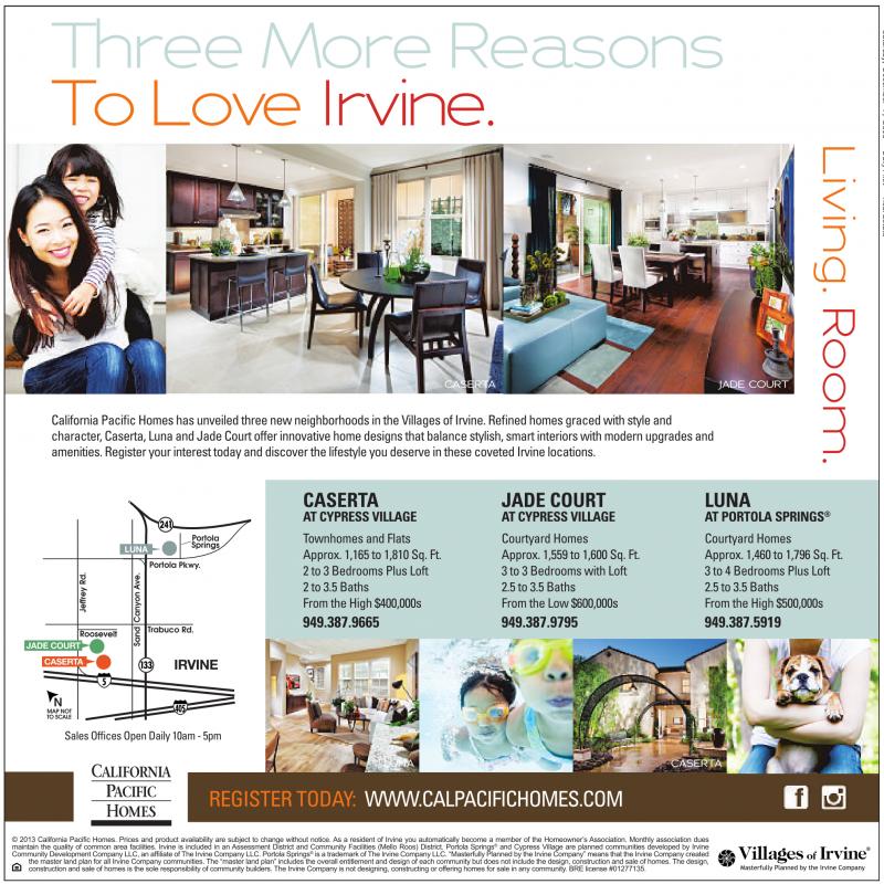 ©2013 California Pacific Homes. Prices and product availability are subject to change without notice. As aresident of Irvine you automatically become amember of the Homeowner’s Association. Monthly association dues maintain the quality of common area facilities. Irvine is included in an Assessment District and Community Facilities (Mello Roos) District. Portola Springs ® and Cypress Village are planned communities developed by Irvine Community Development Company LLC, an affiliate of The Irvine Company LLC. Portola Springs ® is atrademark of The Irvine Company LLC. “Masterfully Planned by the Irvine Company” means that the Irvine Company created the master land plan for all Irvine Company communities. The “master land plan” includes the overall entitlement and design of each community but does not include the design, construction and sale of homes. The design, construction and sale of homes is the sole responsibility of community builders. The Irvine Company is not designing, constructing or offering homes for sale in any community.BRE license #01277135.