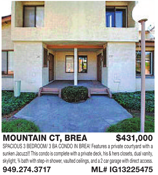 SPACIOUS 3BEDROOM/ 3BACONDO IN BREA! Features aprivate courtyard with asunkenJacuzzi!! This condo is complete with aprivate deck,his &hersclosets, dualvanity,