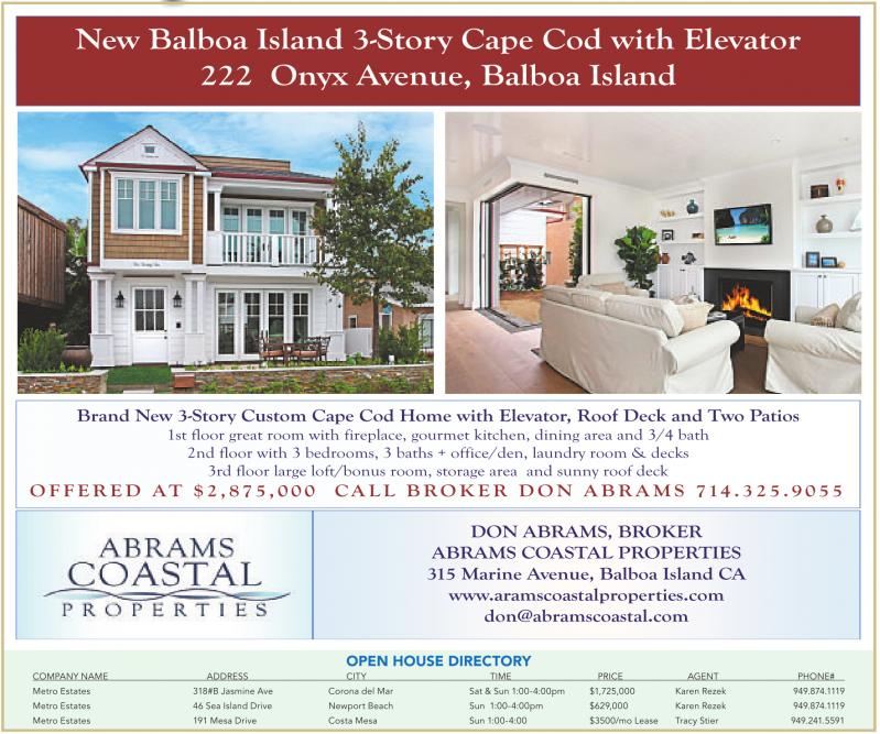 New Balboa Island 3-Story Cape Cod with Elevator 222 Onyx Avenue, Balboa Island Brand New 3-Story Custom Cape Cod Home with Elevator, Roof Deck and Two Patios 1st floor great room with fireplace, gourmet kitchen, dining area and 3/4 bath 2nd floor with 3 bedrooms, 3 baths + office/den, laundry room & decks 3rd floor large loft/bonus room, storage area and sunny roof deck O F F E R E D AT $ 2 , 87 5 , 0 0 0 CA L L B RO K E R D O N A B R A M S 714 . 3 2 5 . 9 0 5 5DON ABRAMS, BROKER ABRAMS COASTAL PROPERTIES 315 Marine Avenue, Balboa Island CA www.aramscoastalproperties.com don@abramscoastal.com OPEN HOUSE DIRECTORY COMPANY NAME ADDRESS CITY TIME PRICE AGENT PHONE# Metro Estates 318#B Jasmine Ave Corona del Mar Sat &Sun 1:00-4:00pm $1,725,000 Karen Rezek 949.874.1119 Metro Estates 46Sea Island Drive Newport Beach Sun 1:00-4:00pm $629,000 Karen Rezek 949.874.1119 Metro Estates 191 Mesa Drive Costa Mesa Sun 1:00-4:00 $3500/mo Lease Tracy Stier 949.241.5591