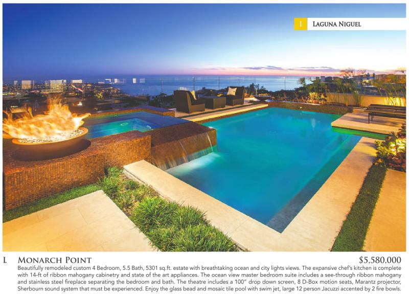 with 14-ft of ribbon mahogany cabinetry and state of the art appliances. The ocean view master bedroom suite includes a see-through ribbon mahogany and stainless steel fireplace separating the bedroom and bath. The theatre includes a 100” drop down screen, 8 D-Box motion seats, Marantz projector, Sherbourn sound system that must be experienced. Enjoy the glass bead and mosaic tile pool with swim jet, large 12 person Jacuzzi accented by 2 fire bowls.