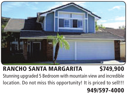 RANCHO SANTA MARGARITA $749,900 Stunningupgraded 5Bedroom with mountain view andincredible location. Do not miss this opportunity! It is priced tosell!!!