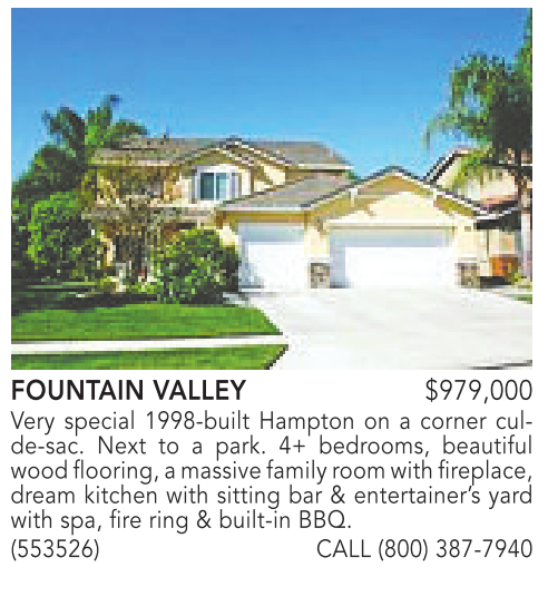 FOUNTAIN VALLEY $979,000 Very special 1998-built Hampton on a corner culde-sac. Next to a park. 4+ bedrooms, beautiful wood flooring, amassive family room with fireplace, dream kitchen with sitting bar & entertainer’s yard with spa, fire ring & built-in BBQ. (553526) CALL (800) 387-7940