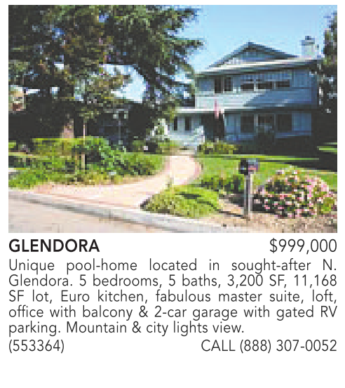 GLENDORA $999,000 Unique pool-home located in sought-after N. Glendora. 5 bedrooms, 5 baths, 3,200 SF, 11,168 SF lot, Euro kitchen, fabulous master suite, loft, office with balcony & 2-car garage with gated RV parking. Mountain & city lights view. (553364) CALL (888) 307-0052