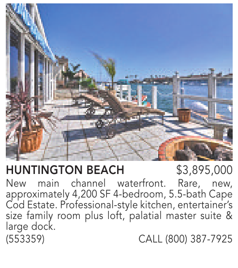 HUNTINGTON BEACH $3,895,000 New main channel waterfront. Rare, new, approximately 4,200 SF 4-bedroom, 5.5-bath Cape Cod Estate. Professional-style kitchen, entertainer’s size family room plus loft, palatial master suite & large dock. (553359) CALL (800) 387-7925